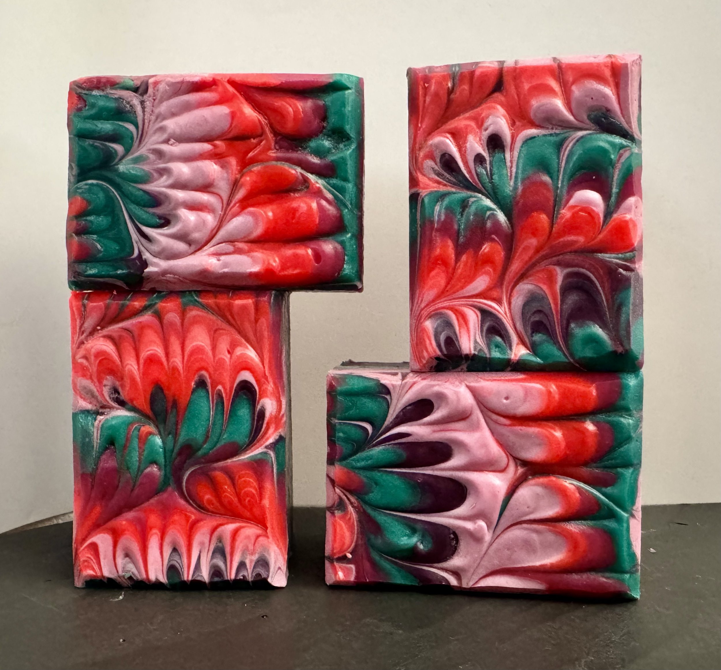 Requirements: Four or more colors of soap poured in horizontal lines throughout the mold. Use a raking technique to first create a nonpareil swirl then add vertical s-curves to create the peacock feathers or bouquet. The peacock bouquets should be clearly defined and each color should be clearly visible.